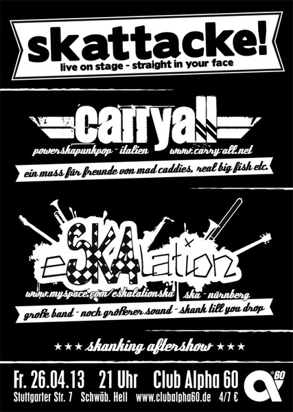 CARRY-ALL haben uns leider kurzfristig abgesagt. Wir konnten dennoch einen hoffentlich adäquaten Ersatz bekommen und wünschen euch trotzdem einen tanzlastigen SKA-Nighter.