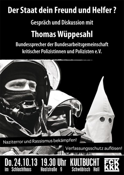 „Zschäpe, Mundlos, Bönhardt und gleichzeitig waren etliche Polizisten aus Baden Württemberg präsent. Man ließ dann die Sau raus: harter Rechtsrock wurde gespielt, es fanden natürlich entsprechende Gespräche statt… “ berichtet Thomas Wüppesahl