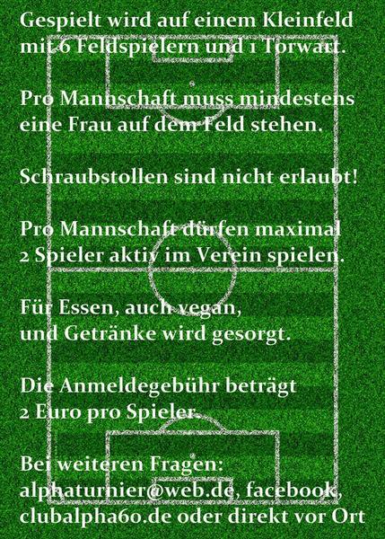 Der Alpha-Cup, das traditionsreiche Gerümpelturnier des club alpha 60, findet am 21.06. beim Schenkensee-Stadion statt. Hobbyspielgemeinschaften können sich unter alphaturnier@web.de anmelden.