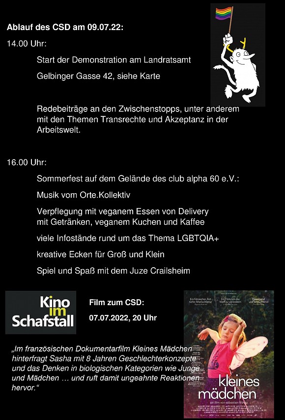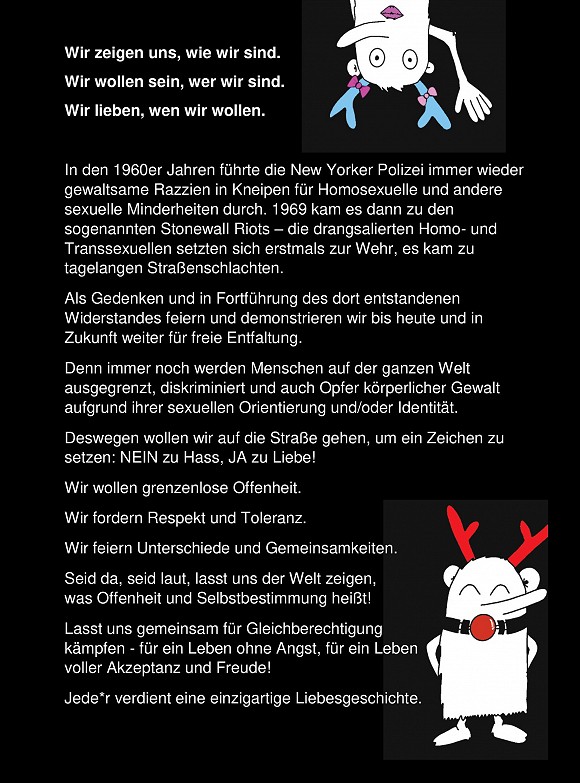 Wer Dienstagabends verhindert ist, aber sich trotzdem gerne einbringen würde, kann sich auch gerne melden – wir haben einen gesonderten CSD-Verteiler einrichten lassen und werden dort in regelmäßigen Abständen über unseren Planungsfortschritt informieren.