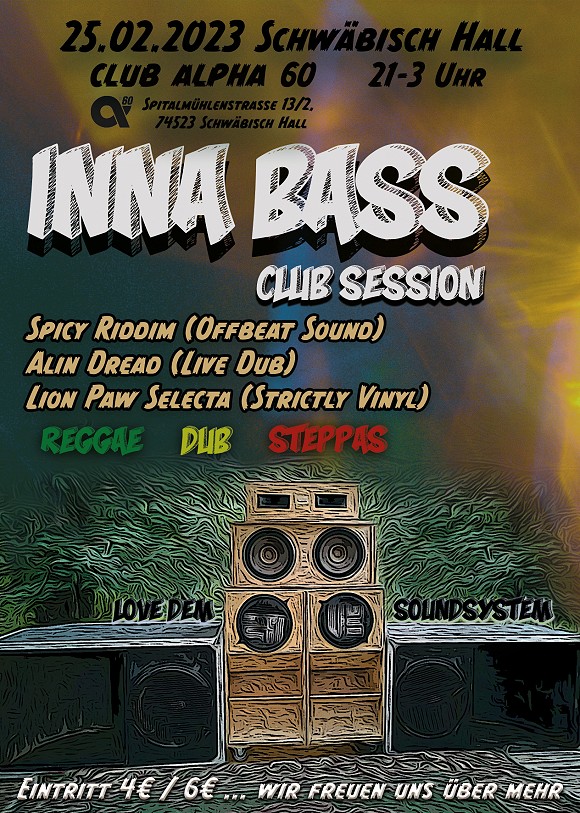 INNA BASS… ist Bassmassage, ist Reggae, ist Dub, ist Soundsystem Kultur - in Schwäbisch Hall. Das “Love Dem Soundsystem” trifft auf drei Reggae Lovers an den Decks.