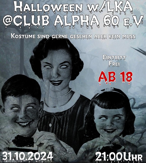 Halloween im Club Alpha 60 e.V. mit der LKA Crew. Jetzt fragt ihr euch bestimmt: LKA??? Was ist das denn??? LKA steht für Lazer Kickz Anlage und ist ein Kollektiv aus vielen kreativen Köpfen, die seit ein paar Jahren das Schwäbisch Haller Umland unsicher machen. Mit ihren wilden Partys und dem dazu passenden musikalischen Mix aus verschiedensten elektronischen Musikrichtungen bringen sie immer viel gute Laune auf den Dancefloor.